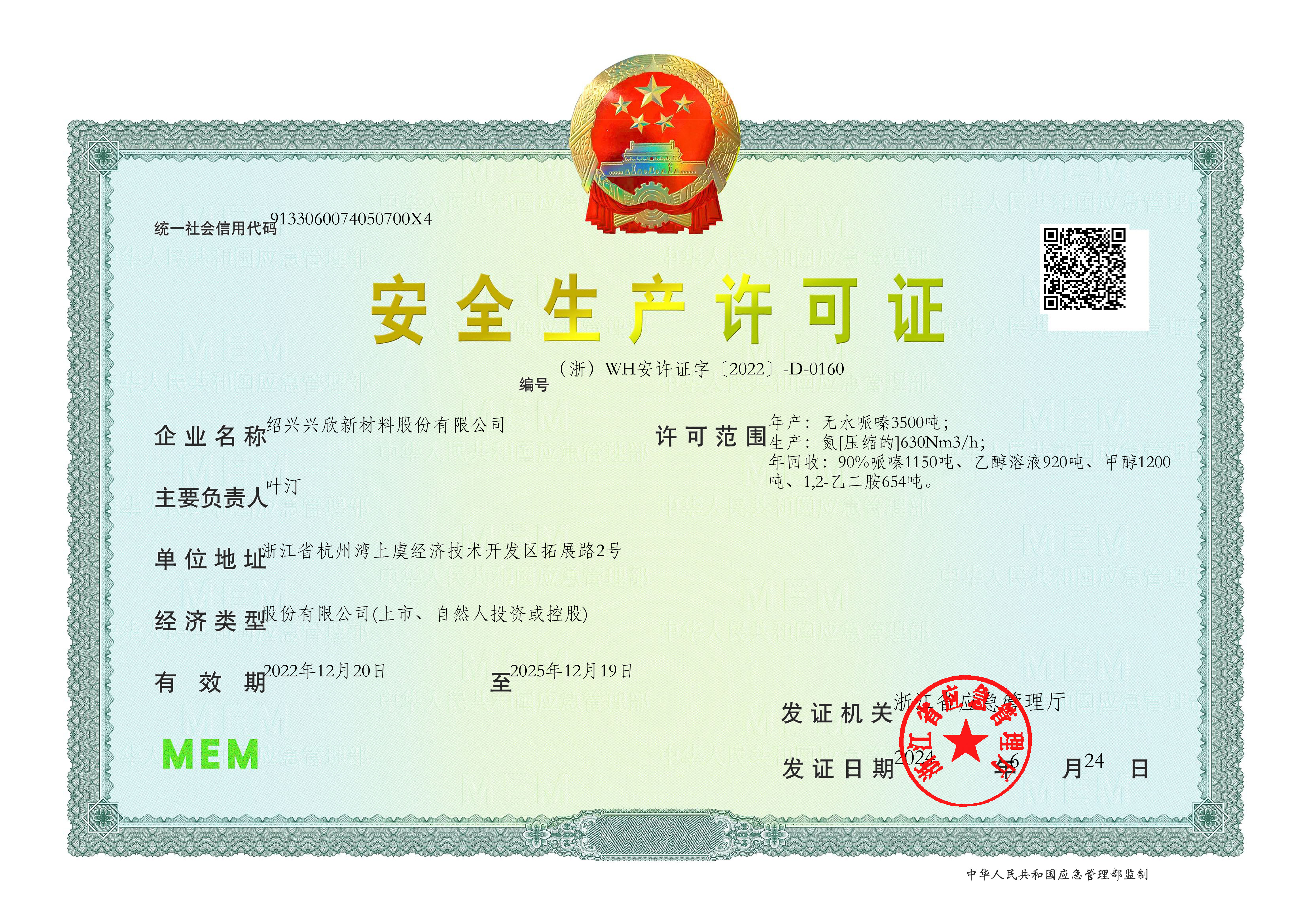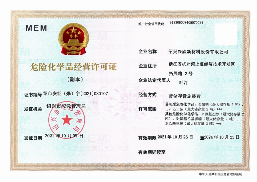 紹興興欣新材料股份有限公司成立于2002年06月27日,占地面積122畝,位于杭州灣上虞經(jīng)濟(jì)技術(shù)開(kāi)發(fā)區(qū)拓展路2號(hào),現(xiàn)有職工200余人,專業(yè)技術(shù)人員50余人;博士、碩士研究生30余人組成的一支知識(shí)型、專業(yè)化的技術(shù)科研團(tuán)隊(duì)。公司面向全球市場(chǎng),專業(yè)開(kāi)發(fā)電子化學(xué)品、環(huán)保化學(xué)品、醫(yī)藥中間體、高分子材料等先進(jìn)新材料重點(diǎn)領(lǐng)域的省級(jí)科技型企業(yè);建有浙江上虞、安徽東至兩個(gè)生產(chǎn)基地。目前為“國(guó)家高新技術(shù)企業(yè)”、浙江省“隱形冠軍”企業(yè)、浙江省專精特新中小企業(yè);建有“省級(jí)”研究開(kāi)發(fā)中心,共建天津大學(xué)浙江紹興研究院電子化學(xué)品研發(fā)中心。
